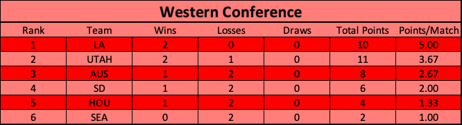 LA takes a firm grip on the top spot with Utah dropping points. Austin’s win over Houston pushes them to three, while Seattle’s bye keeps them at the bottom of the ocean.
